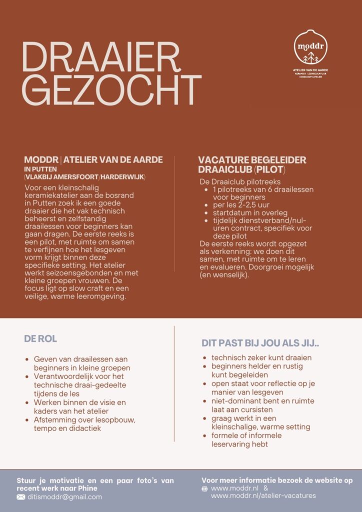 Voor mijn kleinschalige keramiekatelier, direct aan de bosrand in Putten, zoek ik een goede draaier die het vak technisch beheerst en zin heeft om te groeien in het geven van draailessen in kleine groepen.